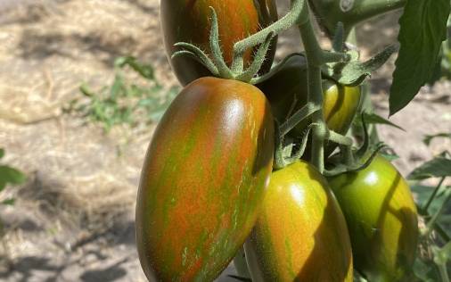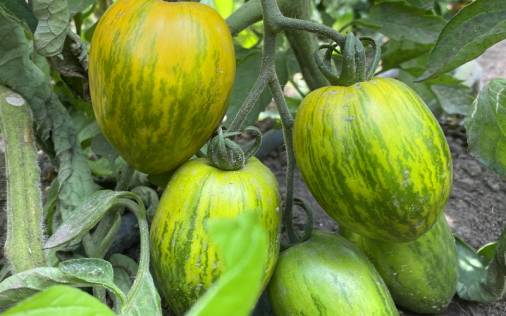 Grünreife Tomaten mit grünen Streifen. Oval- spitz zulaufend, optimale Salattomaten-Grösse. Cremig-weiches, unglaublich zartes Fruchtfleisch. Wenig Säure und doch ein tolles Aroma zeichnet diese Frucht aus.