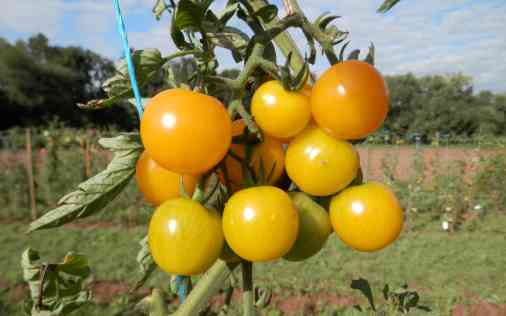 Sehr aromatische, süß-saftige Cocktailtomate. Die leuchtend gelben Früchte hängen in schönen kurzen Trauben. Robuste und wüchsige Pflanze mit lockerem Laub und hoher Feldresistenz gegenüber der Kraut- und Braunfäule (Phytophthora infestans). Die Sorte ist frühreif und hat ein Fruchtgewicht von ca. 20g.