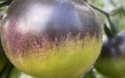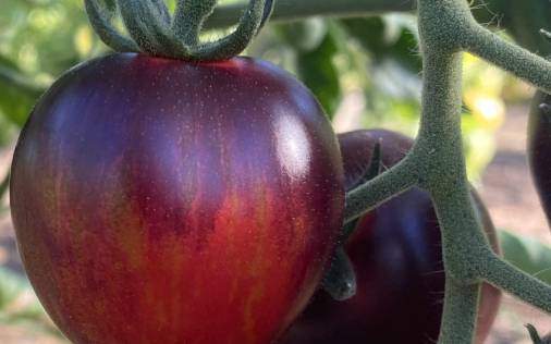 Die komplexe Tomate: Stark wüchsige Pflanze, krautfäuleresistent, Freilandtomate. Auch für das Gewächshaus geeignet oder die Topfkultur. 15-20 Liter Topf ist perfekt. Die Blätter sind bei der Jungpflanze schwarz, werden aber im Laufe der Zeit dunkelgrün mit teilweise schwarzen Flecken.