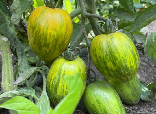 Green ripe tomatoes with green stripes. Oval-tapered, optimal salad tomato size. Creamy-soft, incredibly tender flesh. Little acidity and yet a great aroma characterises this fruit.