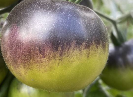 The complex tomato: Strong growing plant, blight resistant, outdoor tomato. Also suitable for the greenhouse or pot culture. 15-20 litre pot is perfect. The leaves are black when the plant is young, but turn dark green with partly black spots over time.
