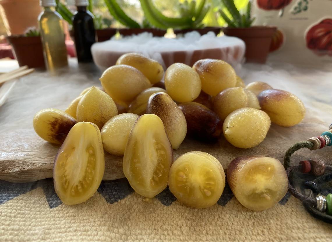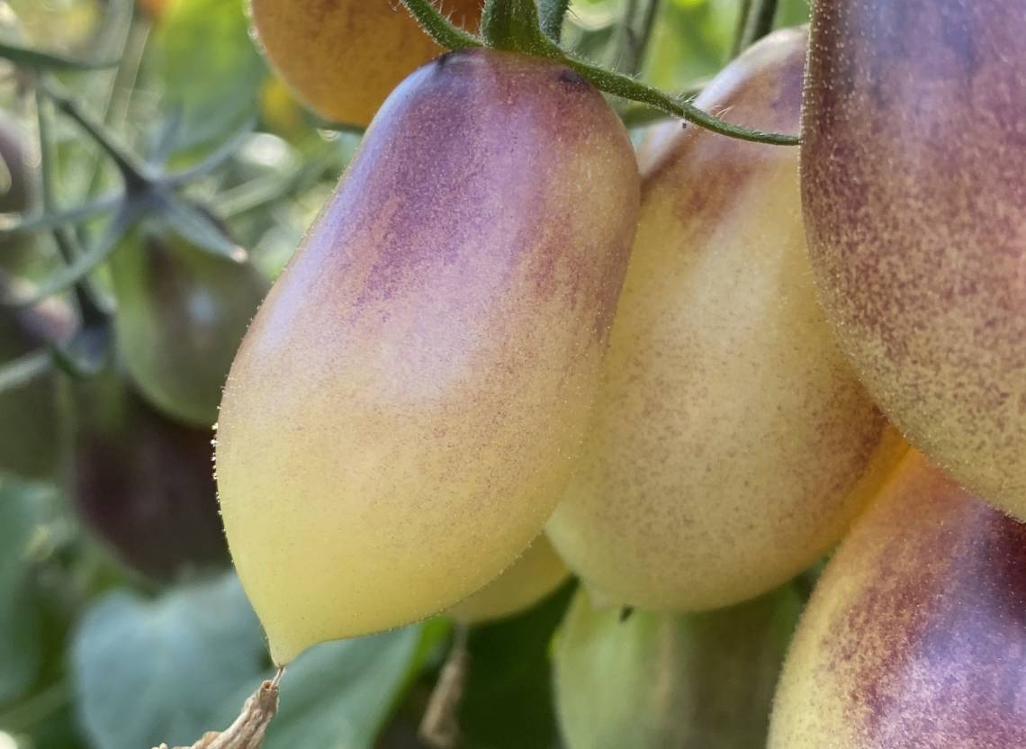 Die Früchte werden Dich begeistern. Schneeweiß mit einem schwarzen "Nebel" an den sonnigen Seiten der Tomate. Sie haben die Form einer Amphore. Länglich mit Spitze. Der Geschmack ist wunderbar süss. Es sind auch exotische Aromen vorhanden: Mango, Mispel, etwas Babaco vielleicht. Ein wenig tomatig rundet das tolle Aroma ab. Bei früher Ernte sind sie sehr mild, bei vollreifer Ernte sehr süss.