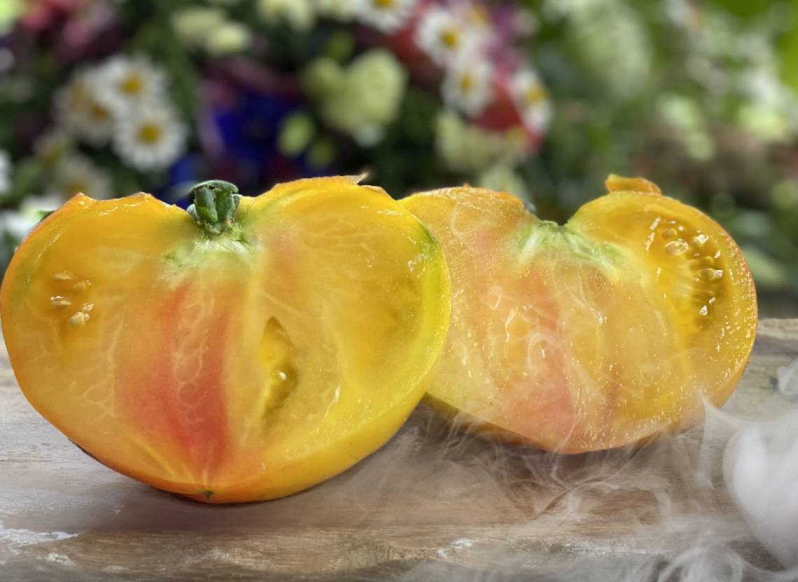 Die herzförmigen Früchte werden Dich entzücken. Gelb-Orange - unten Rot. Innen gelb mit einem roten Streifen. Cremiges Fruchtfleisch, weich und rund im Geschmack. Sehr exotisch. Aromen nach Ananas, Mango, Pitahaya. Süss. Saftig-harmonisch.