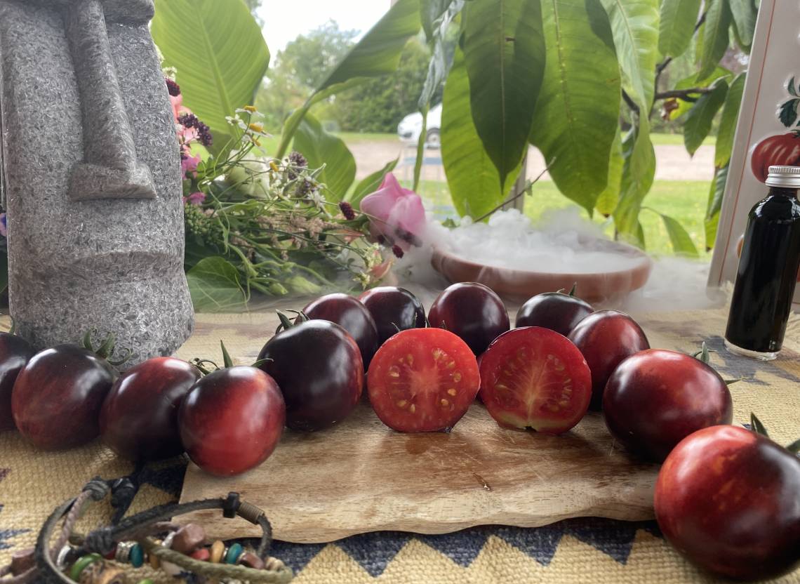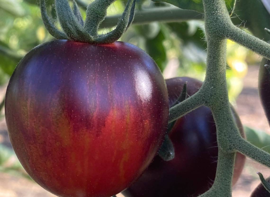 Tief schwarze, glänzende Früchte, unten rot mit gelben, orangen und grünen Streifen. Eine der Schönsten uns bekannten Tomaten. Anderer Geschmack. Eben herb! Ernte sie vollreif und Du wirst mit einer anderen Geschmacksvariante belohnt.